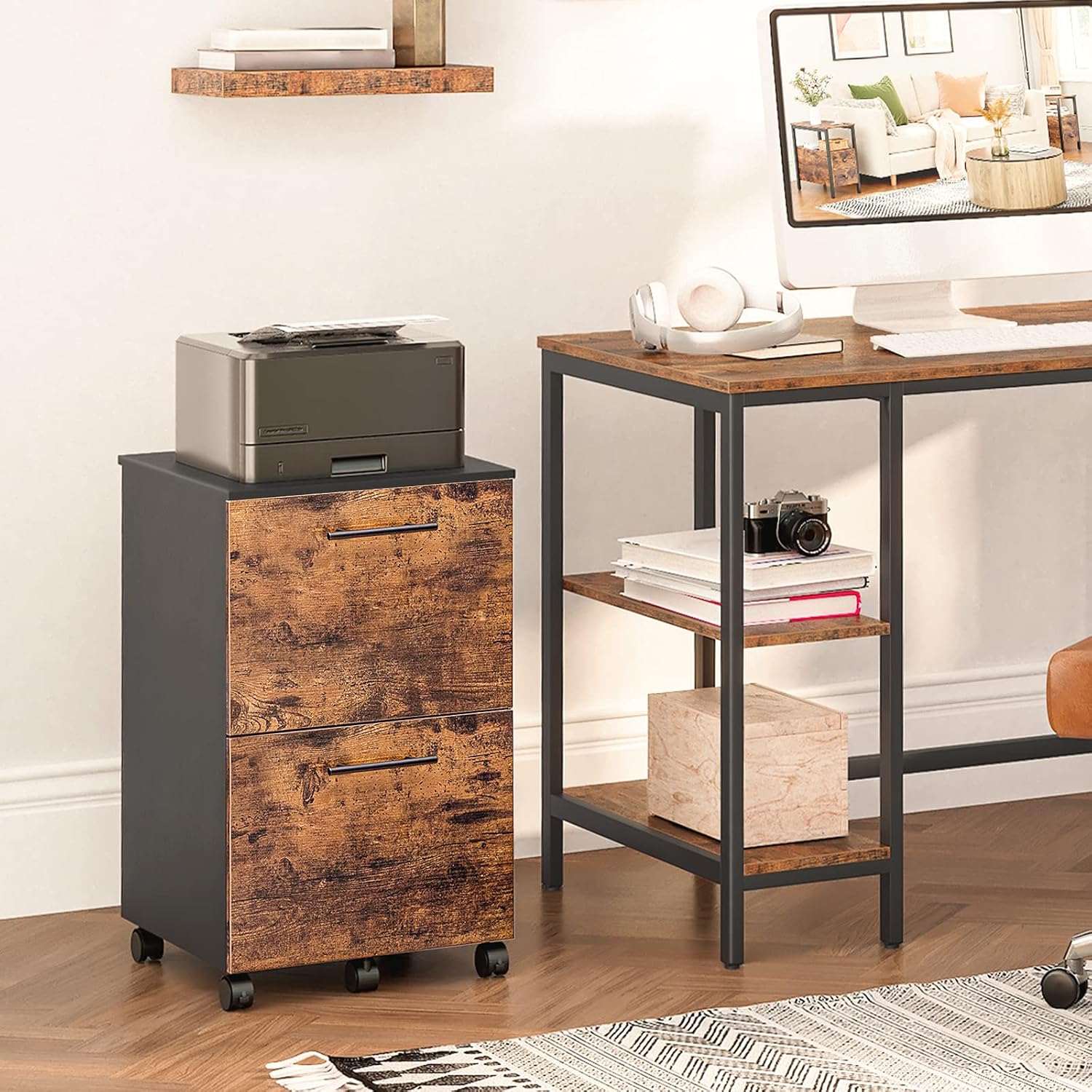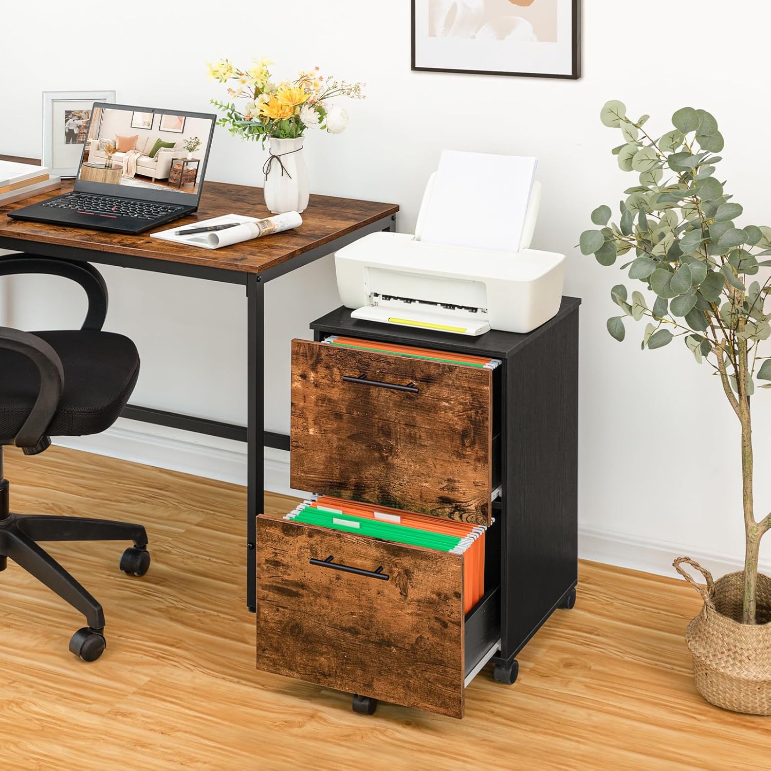 HOOBRO 2 Drawer Mobile File Cabinet, Rolling Printer Stand, Rolling Office Cabinet with 5 Wheels, Wooden Vertical Filing Cabinet fits A4/Letter Size for Home Office, Rustic Brown and Black BF03WJ01G1