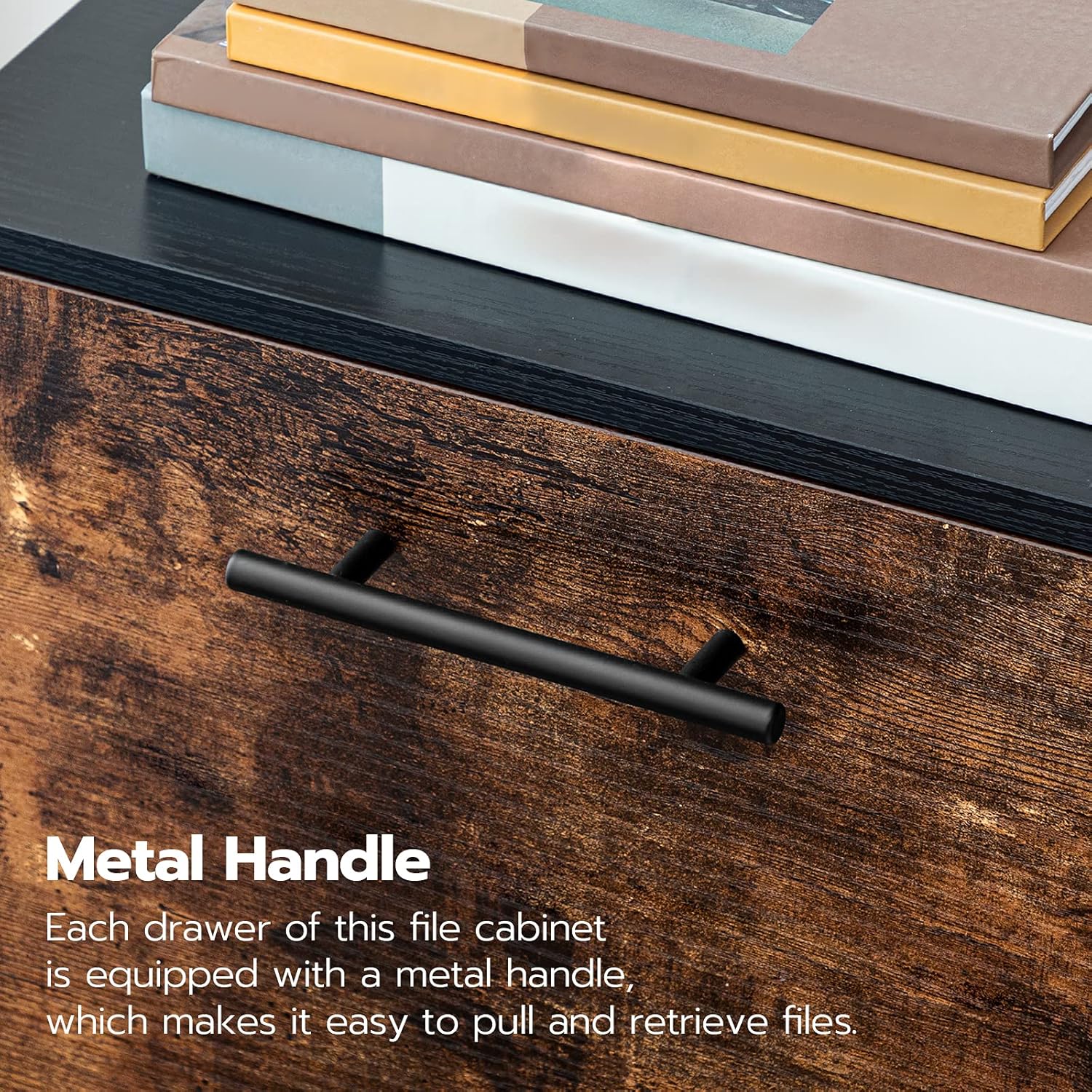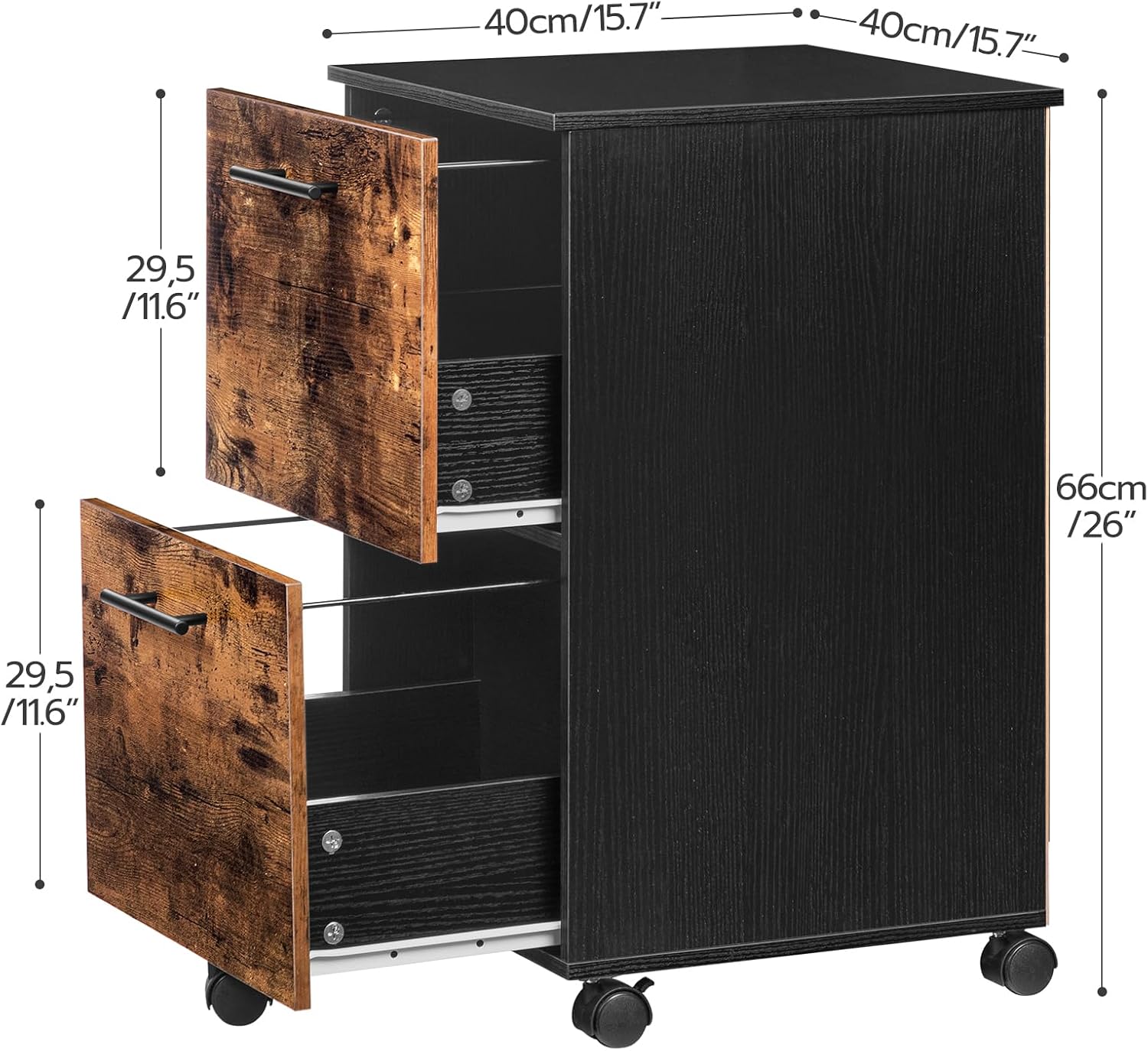Crafted with high-quality wood in a charming rustic brown and black finish, this vertical filing cabinet effortlessly blends in with any decor while adding a touch of sophistication to your office. The compact yet spacious design allows you to neatly organize your A4 or letter-sized documents, keeping your workspace clutter-free and organized.